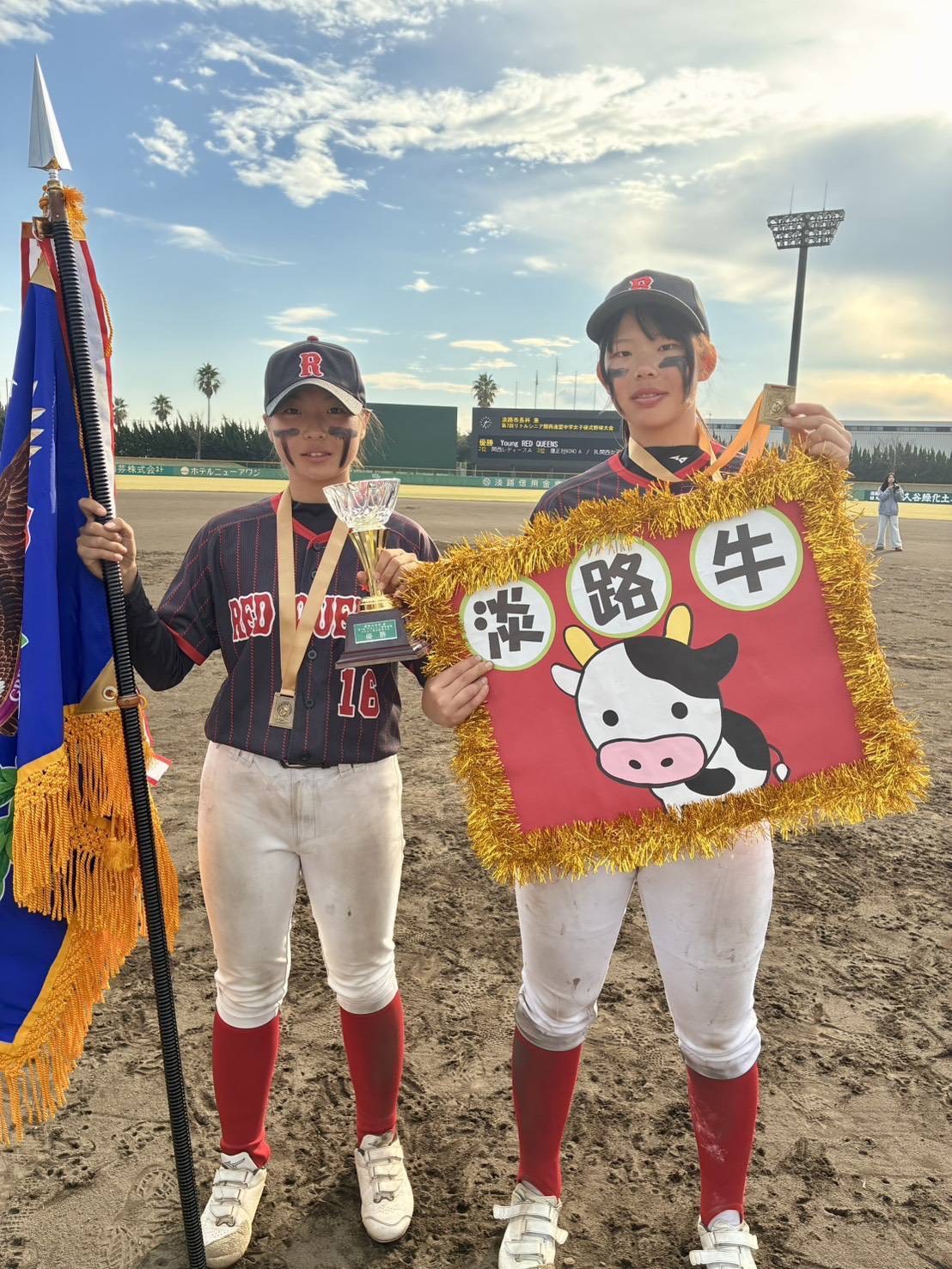 奈良ヤング(現在所属7期生)三年生選手 米田まつり選手 泉ひな選手が所属するヤングREDQUEENSが11月22日~24日に淡路島で開催されました関西連盟中学女子硬式野球大会で優勝されました。